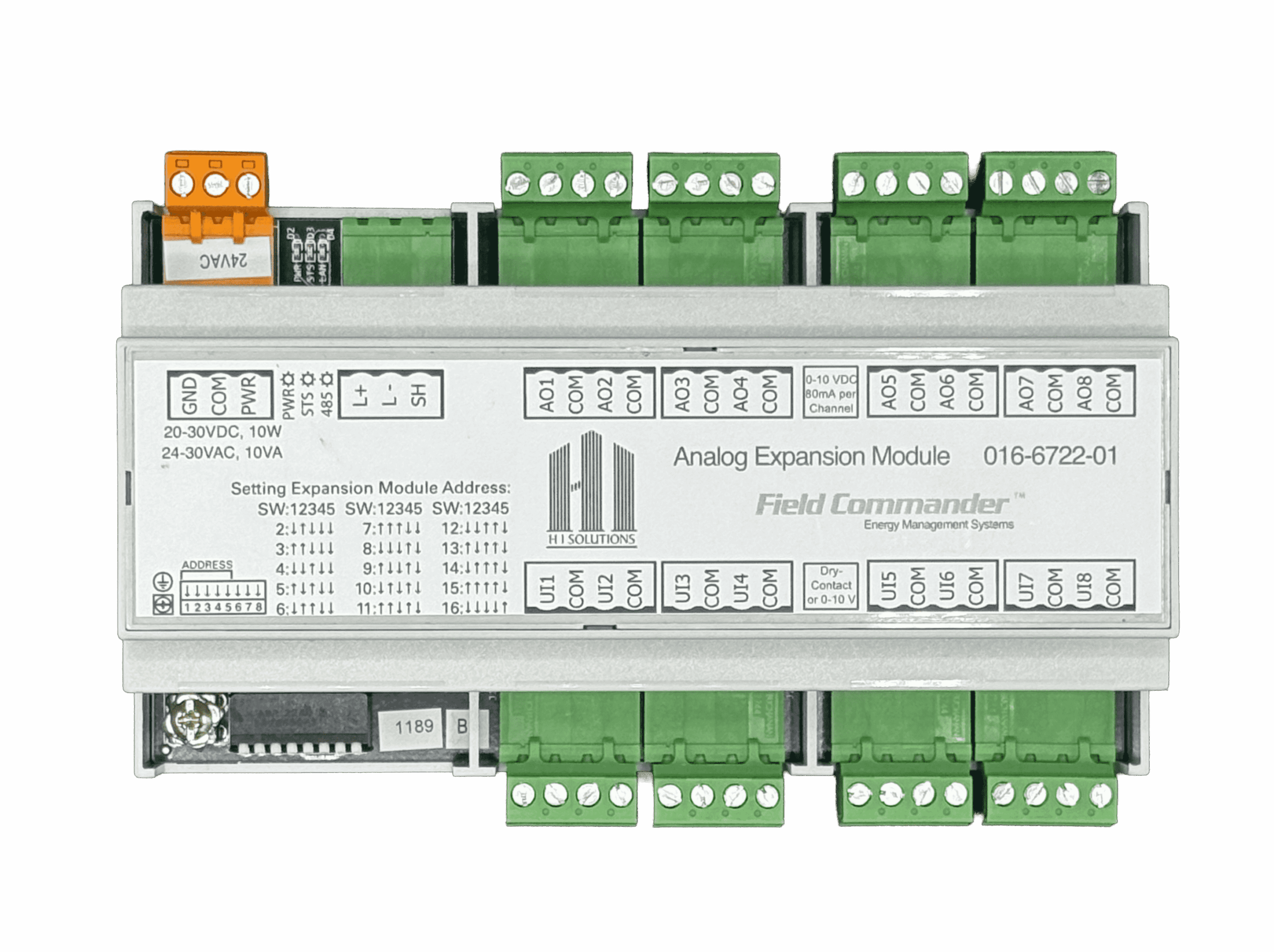 The Analog Expansion Module (AEM) provides 8 additional Universal Inputs and 8 additional Analog Outputs. These additional I/O points can alleviate the need to purchase an additional Unitary Controller to pick up a few extra inputs.